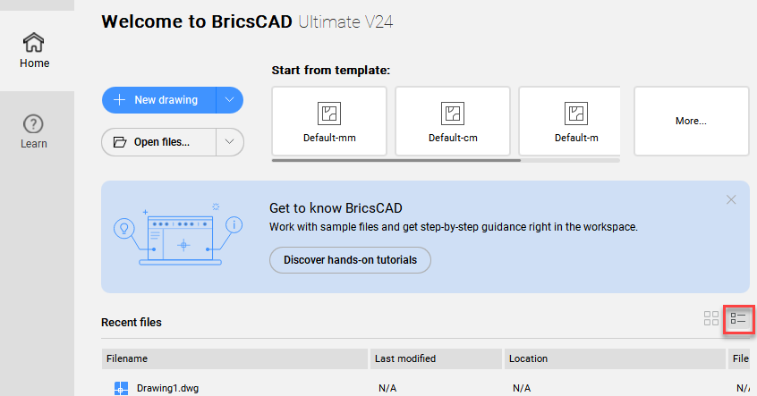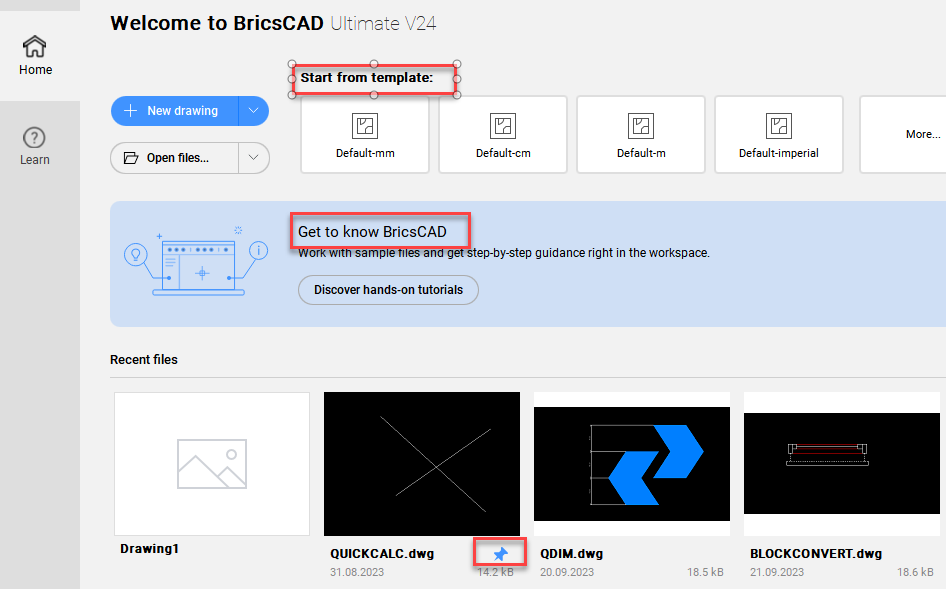 Die Startseite wurde überarbeitet. Sie enthält ein Feld zur direkten Vorlagenwahl, ein Benachrichtigungsfeld, eine Tabellenansicht für die neuesten Zeichnungen und die Möglichkeit, zuletzt verwendete Zeichnungen anzuheften, damit sie ganz oben in der Liste stehen.