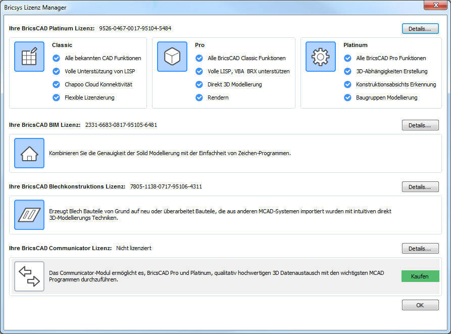- Klicken Sie im DialogBricsys Lizenz Manager auf die Schaltfläche Details... neben der Anwendung, für die Sie die Lizenz verwalten möchten. Der Dialog Lizenz Informationen wird geöffnet.