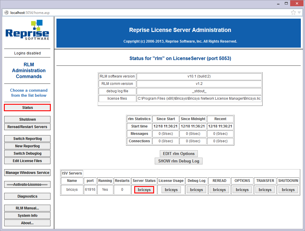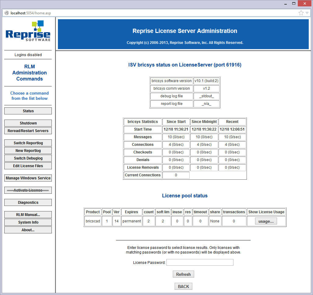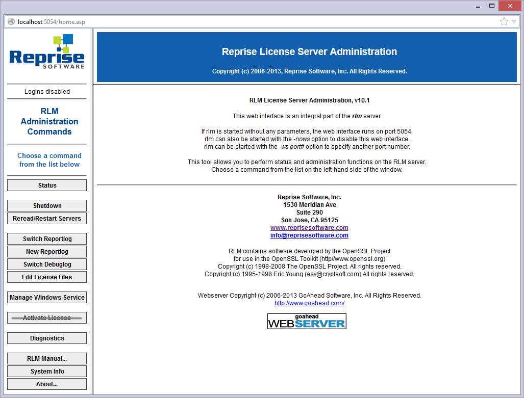 - Gehen Sie zur Adresse http://localhost:5054. Das Reprise License Server Administration Web Interface wird geöffnet.