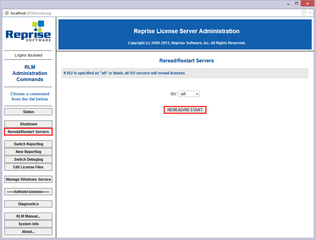 Klicken Sie auf die Schaltfläche Reread/Restart Servers. Der Server wird neugestartet und liest die Netzwerk Lizenz erneut.