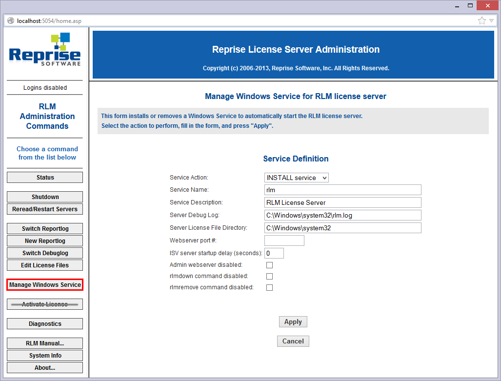 Klicken Sie auf die Schaltfläche Manage Windows Service auf der linken Seite. Die Seite Manage Windows Service for RLM license server wird geöffnet.