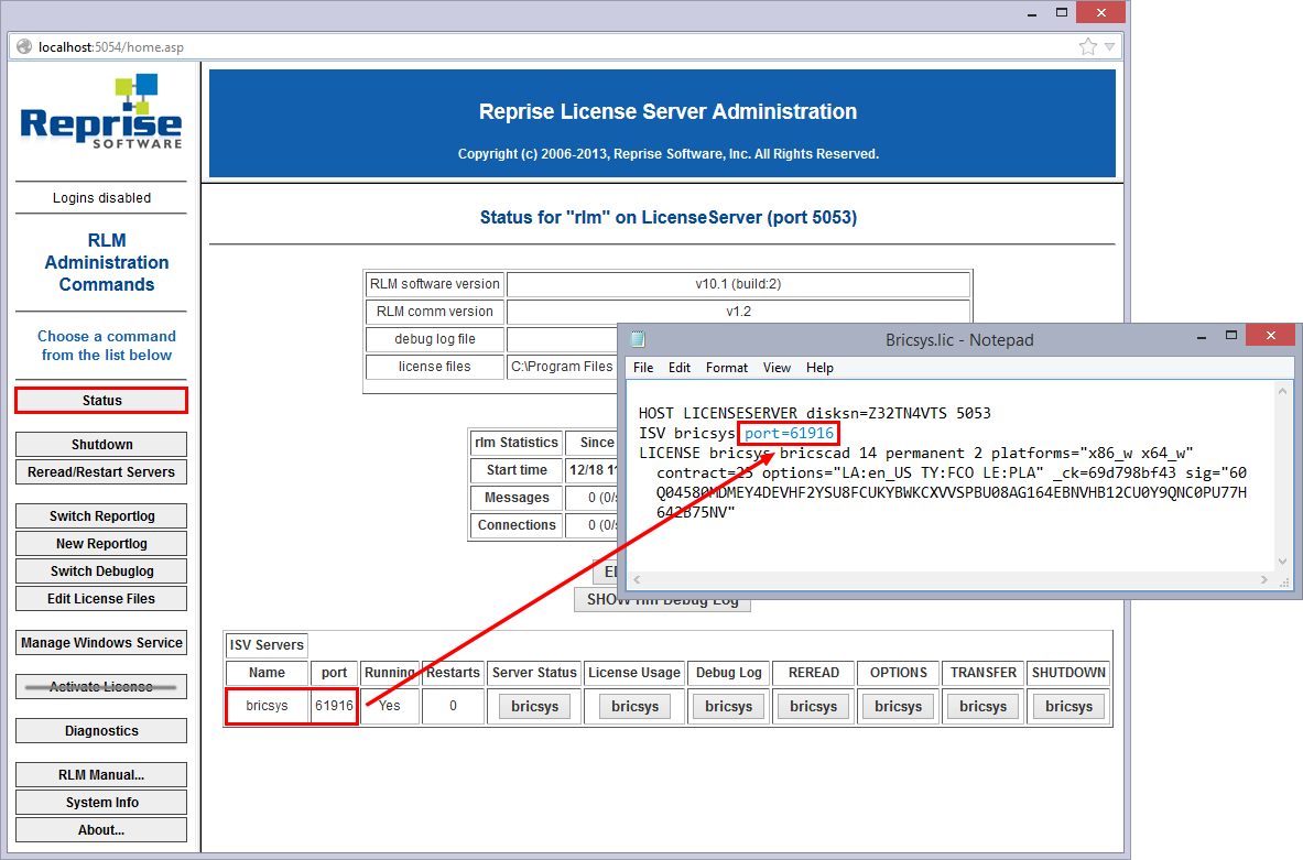 - Klicken Sie auf die Schaltfläche Status auf der linken Seite. Die Seite Status for "rlm" on [LicenseServer] (port 5053) wird geöffnet.