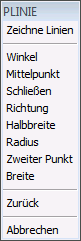 BricsCAD Befehle haben oft mehrere Optionen. Diese Optionen werden in der Statuszeile oder der Befehlszeile und auch in einem Kontext Menü angezeigt. Das Befehls Kontext Menü wird per Vorgabe in der oberen rechten Ecke des Bildschirms angezeigt. Z. B. klicken Sie auf Radius im PLINIE Kontext Menü, um den Radius des aktuellen Bogensegmentes einer Polylinie zu definieren.