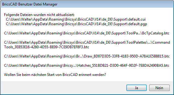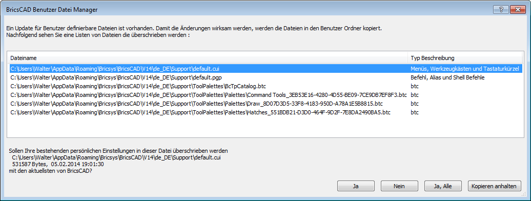 Wenn Sie ein Update der Software installiert haben, wird beim ersten Start von BricsCAD nach dem Update der Inhalt des UserDataCache Ordners (C:\Programme\Bricsys\BricsCAD\UserDataCache) mit dem Inhalt des Local root Ordners und dem Roamable root Ordner des Benutzers verglichen. Wenn Sie die Dateien in diesen Ordnern angepasst haben und eine oder mehrere der zugehörigen Dateien in den Ordner UserDataCache neuere sind, wird der BricsCAD Benutzer Datei-Manager gestartet, und fragt Sie, ob Sie Ihre Dateien behalten wollen oder Ihre Dateien mit der aktualisierten Dateien zu überschreiben.