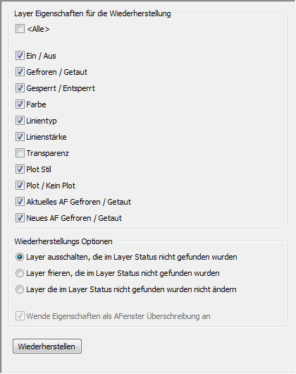 In den Standardeinstellungen für einen neuen Layer Status sind alle Layer Eigenschaften ausgewählt, um sie wiederherzustellen. |