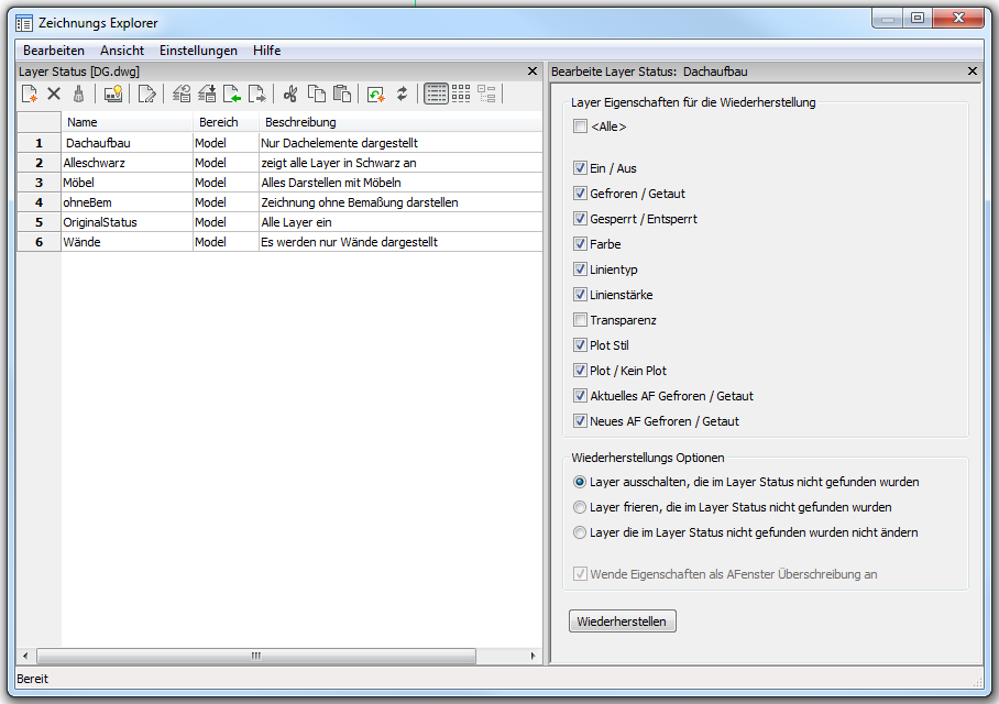 Zeichnungs Explorer Layer Status (Detailansicht): |