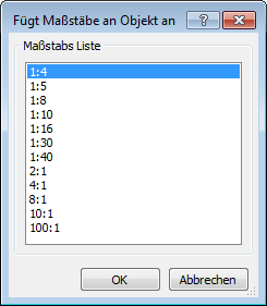 Es sind nur Skalierungen verfügbar die in der Maßstab Liste der Zeichnung vorhanden sind. Verwenden Sie den Befehl MSTABLISTEBEARB zur Bearbeitung der Zeichnungsmaßstäbe. |