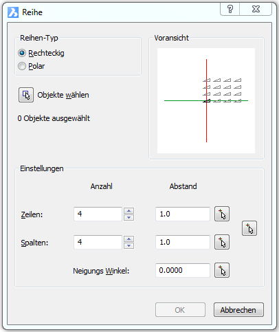 Der Befehl ReiheClassic erstellt polare oder rechteckige Anordnungen eines Objektes über die Eingabe in einem Dialog.