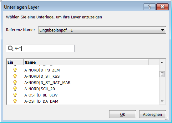 - Vollst. Pfad: Im vollständige Pfad wird gesucht, wenn die Zeichnung geladen wird. Wenn die Auflage dort nicht gefunden wird, wird im Ordner der Stammzeichnung gesucht. Wenn die Unterlagen-Datei auch dort nicht gefunden wird, wird am Einfüge-Punkt der PDF-Unterlage der Text "Fehlerhafte oder ungültige Referenz" angezeigt.