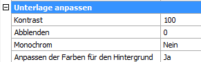 Mit dem Befehl PdfAnpass kann das Ausblendeverhalten, der Kontrast, und die Monochrom-Einstellungen einer PDF-Unterlage in der Befehlszeile eingestellt werden.