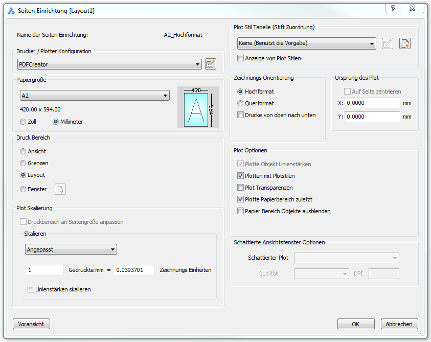 Bearbeitung der Seiteneinrichtung des aktuellen Layout oder Model Bereichs in einem Dialog.