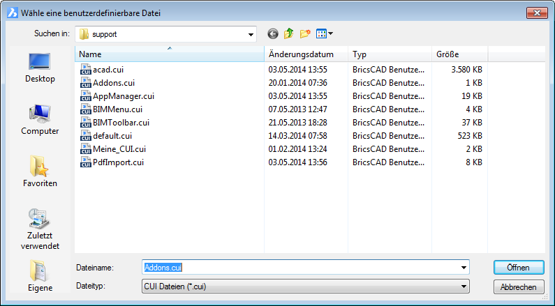 Wählen Sie eine CUI, MNU, MNS, oder ICM Datei aus, und klicken Sie dann auf Öffnen.