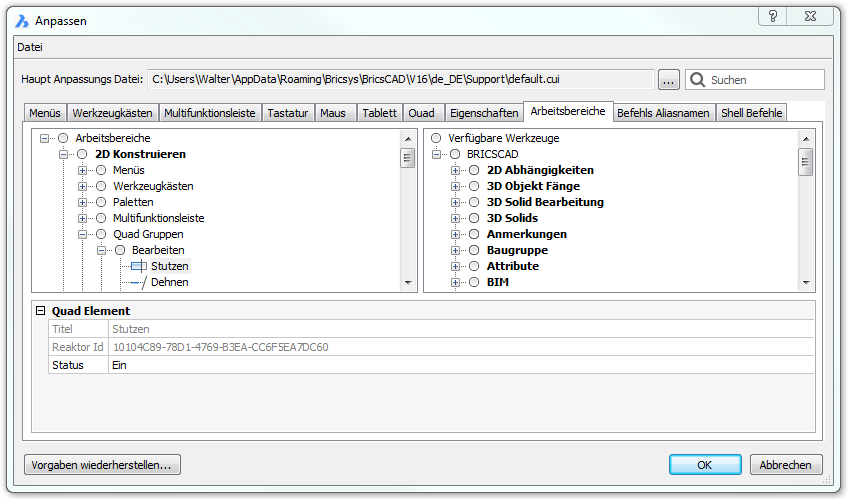 Anpassen - passt die Benutzeroberfläche von BricsCAD an: Menüs, Werkzeugkästen, Tastenkombinationen, Mausaktionen, Tablett, Quad-Einstellungen, Arbeitsbereiche, Aliase und Shell-Befehle.