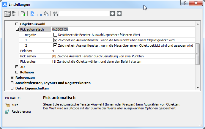 Legt fest ob BricsCAD das automatische Auswählen, für die "Wähle Objekte" Eingabeaufforderung, über Fenster (innen/kreuzen) ein oder ausschaltet: