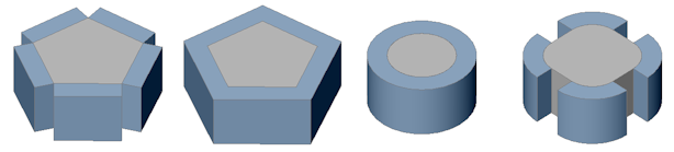 Von links nach rechts: Extrudierte Flächen eines Prisma - verstärkte Flächen eines Prisma - verstärkte Flächen eines Zylinders - verstärkte Abrundungen.