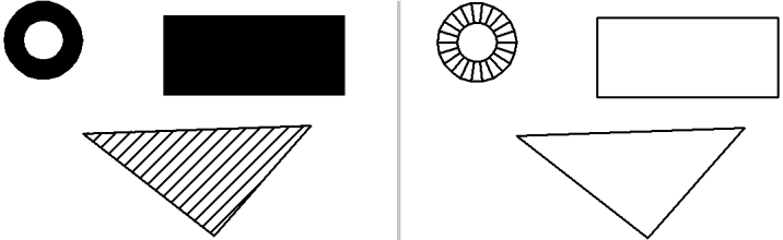 Ring, Rechteck, und schraffierte Fläche. Links: Füllen ein, Rechts: Füllen aus.