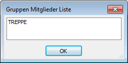 Listet die Namen der Gruppen der gewählten Objekte in der Zeichnung auf. Das Dialogfenster wird temporär geschlossen und Sie werden zu folgendem aufgefordert: Wähle Objekt - wählen Sie ein oder mehrere Objekte aus. Wähle Objekt - wählen Sie weitere Objekte oder drücken Sie die Eingabetaste um fortzufahren. Das Dialogfenster Gruppen Mitglieder Liste wird angezeigt: