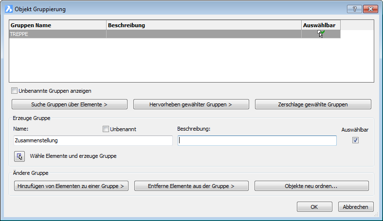 Das Dialogfenster wird temporär geschlossen. In der Befehlszeile werden Sie zu folgendem aufgefordert: Objekte wählen: - wählen Sie eines oder mehrere Objekte. Objekte wählen: - wählen Sie eines oder mehrere Objekte, oder drücken Sie die Eingabetaste, um in den Dialog zurückzukehren. Zurück im Dialogfenster werden die gewählten Objekte ein Teil der Gruppe. |