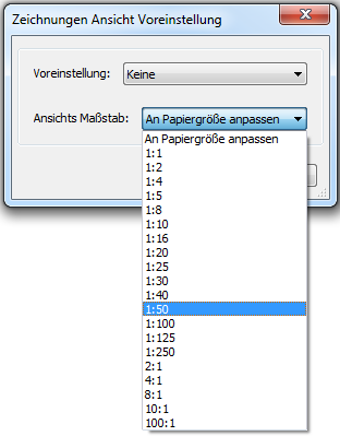 Klicken Sie auf die Option Ansichts Maßstab, und wählen dann einen Maßstab aus. Die verfügbaren Maßstäbe werden mit dem Befehl MSTABLISTEBEARB bearbeitet.