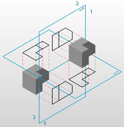 Definiert die Hauptansicht. Dreht das 3D-Modell, so dass die Hauptansicht auf die vertikale Projektionsebene (V.P.) projiziert wird.