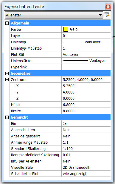 Die Eigenschaften des Ansichtsfensters werden in der BricsCAD Eigenschaften Leiste angezeigt. - Führen Sie einen der folgenden Schritte aus: