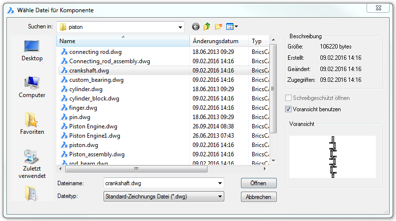 BmÖffnen - öffnet die Quell-Zeichnung einer externen mechanischen Komponente.