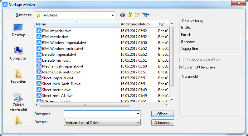 Wählen Sie eine DWT-Vorlagen-Datei oder eine DWG-Datei, und klicken Sie dann auf Öffnen.