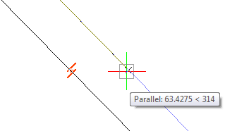 Beim Zeichnen einer Linie, eines Polyliniensegments, einer Klinie oder eines Strahls, bewegen Sie den Cursor über das Objekt zu dem Sie parallel zeichnen möchten: Der parallele Fang-Marker wird auf dem Objekt angezeigt. Warten Sie, bis ein kleines Kreuz angibt, dass das Objekt identifiziert wurde; es wird dann eine Führungs-Linie angezeigt, wenn das Objekt, das Sie zeichnen, parallel zu dem ausgewählten Objekt ist.