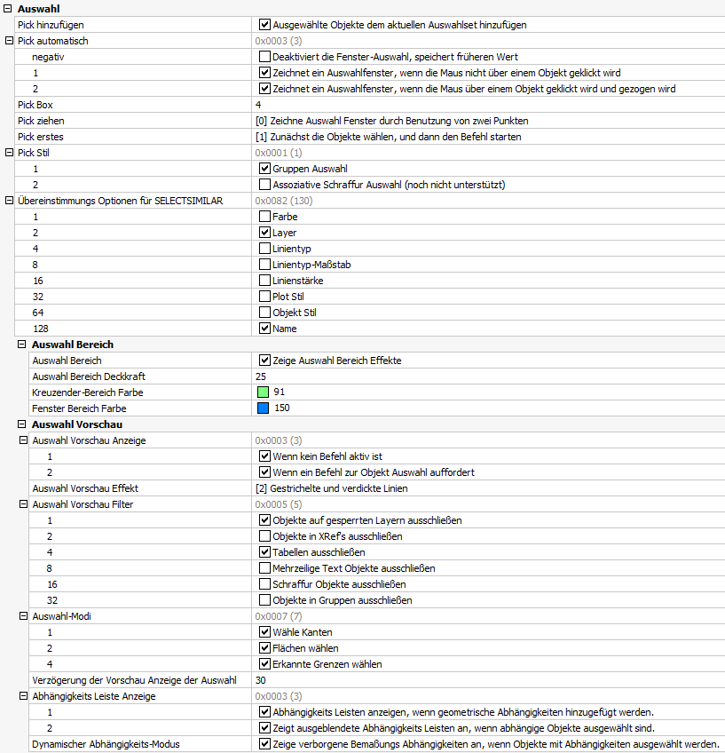 Bei der Auswahl von Objekten in einer Zeichnung werden die Auswahlmethode und die Anzeige der ausgewählten Objekte (z. B. ob Griffe angezeigt werden oder nicht) durch eine Vielzahl von Einstellungen gesteuert.