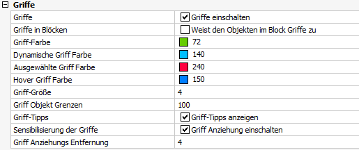 Griff Einstellungen finden Sie unter Anzeige/Sichtweise in der Einstellungsgruppe Zeichnen der Einstellungskategorie Zeichnen im Einstellungen Dialog.