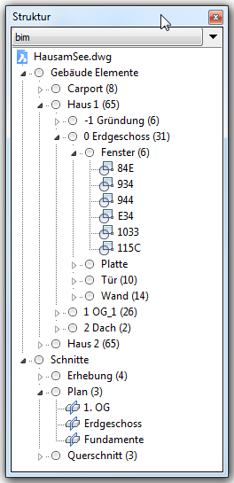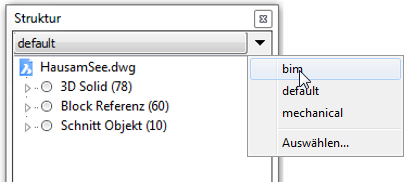 Das andockbare Struktur Panel zeigt eine strukturierte Baumansicht des Zeichnungsinhalts an. Diese strukturierte Ansicht ist vollständig konfigurierbar und Konfigurationen können einfach gespeichert und wieder abgerufen werden. Die *.cst Konfigurationsdateien werden standardmäßig im Support Ordner abgelegt. Im Strukturbaum ausgewählte Objekte können wahlweise gleichzeitig markiert und in der Zeichnung ausgewählt werden, und umgekehrt, bei der Auswahl von Objekten in der Zeichnung können sie optional ausgewählt und im Strukturbaum hervorgehoben werden.