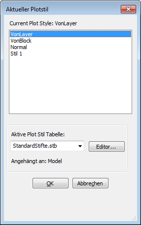 Wenn Zeichnungen nicht für Plotstile eingestellt sind, zeigt dieser Befehl folgenden Dialog: