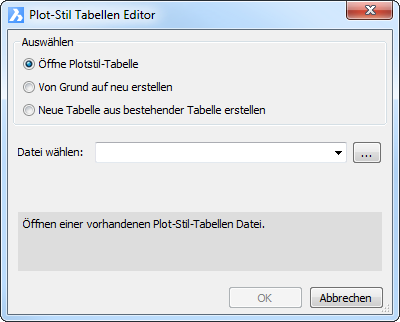 Öffnen Plot Stil Tabelle - hängt eine bestehende Plot-Stil Datei an. Klicken Sie auf die Schaltfläche Durchsuchen ( Klicken Sie auf die Schaltfläche OK, um den Dialog Plot Stil Tabellen Editor zu öffnen. |