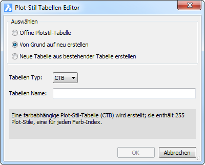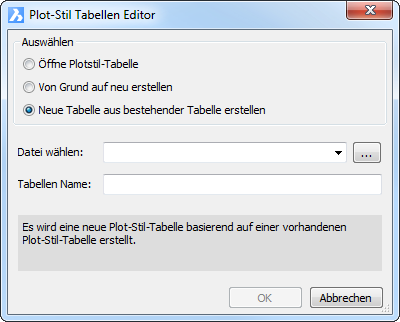 Neue Tabelle aus bestehender Tabelle erstellen - es wird eine neue Plot-Stil Tabelle auf der Grundlage einer bestehenden Plot Stil Tabelle erstellt werden. Wählen Sie eine vorhandene Datei aus der Dropdownliste Datei wählen oder klicken Sie auf die Schaltfläche Durchsuchen ( Geben Sie einen Namen im Feld Tabellen Name ein. Klicken Sie auf die Schaltfläche OK, um den Dialog Plot Stil Tabellen Editor zu öffnen.