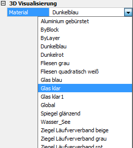- In der Eigenschaften-Leiste unter 3D Visualisierung Material, klicken Sie auf den Pfeil nach unten, und wählen Sie ein Material in der Material-Liste.