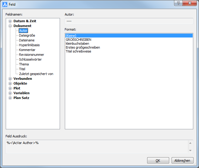 Ein Feld ist für einen variablen Text, um Daten wie z.B. die Zeichnungseigenschaften (Dateiname, aktuelles Datum, ...), benutzerdefinierte Eigenschaften, Plot Einstellungen und Variablen anzuzeigen.