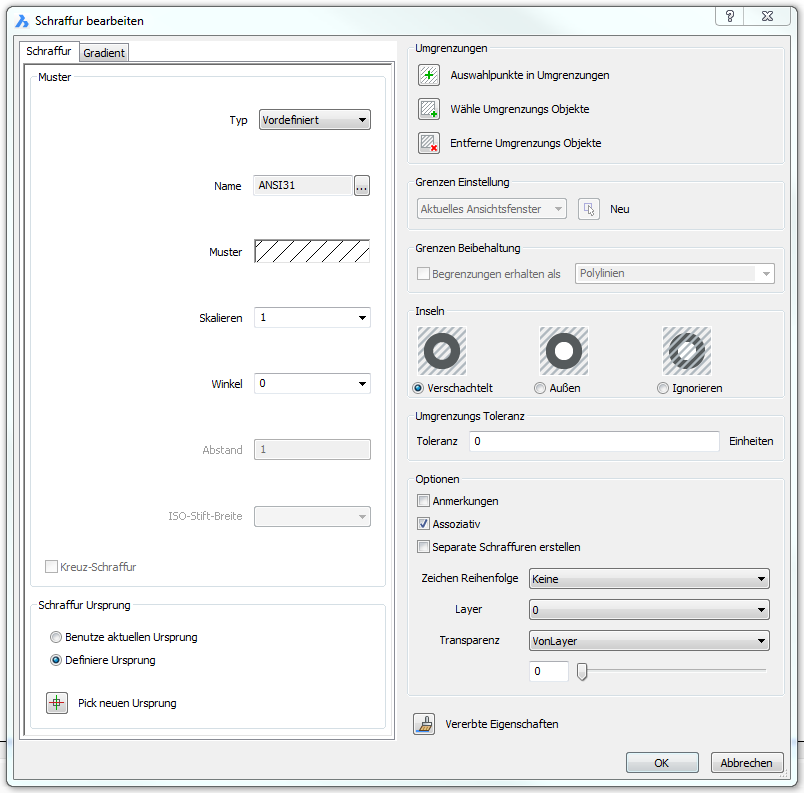 Wenn eine lineare Schraffur oder ein Schraffurmuster ausgewählt ist, sind die Einstellmöglichkeiten gleich wie beim Befehl Schraff.