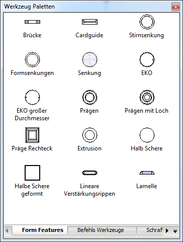 Eine Bibliothek von parametrisierten Blechkonstruktions Form Features steht zur Verfügung. Sie sind auf der Karteikarte Form Features im Werkzeug Paletten Panel verfügbar. Die Bibliothek enthält die am häufigsten verwendeten Form Feature Typen. Um ein Form-Objekt in ein Blechbauteil einzufügen, ziehen Sie das Form Feature Symbol aus dem Werkzeug Paletten Panel zur Lasche des Volumenkörpers.