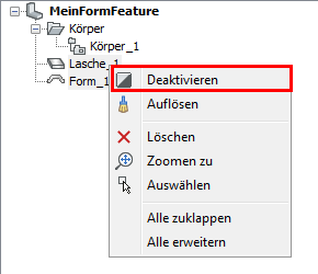 Wählen Sie die Features Lasche_1 und Form_1 im Knoten Körper, klicken Sie dann mit rechts und wählen Sie im Kontextmenü deaktivieren.