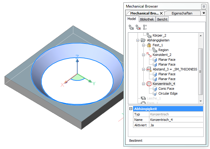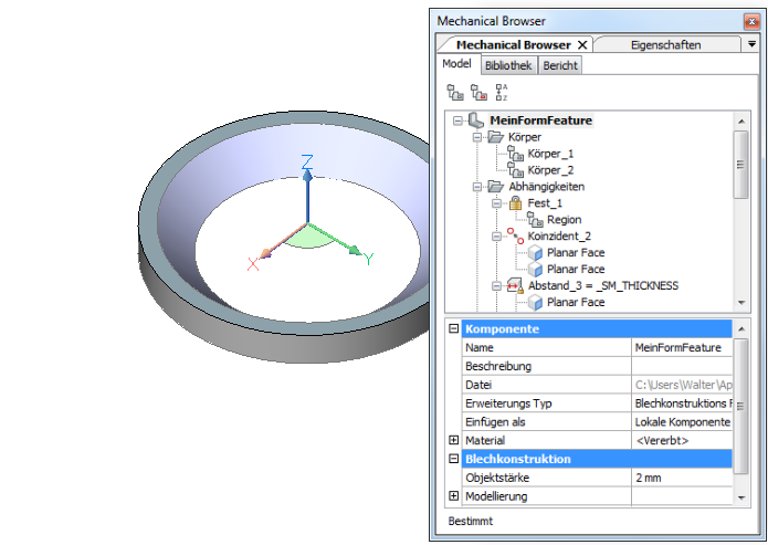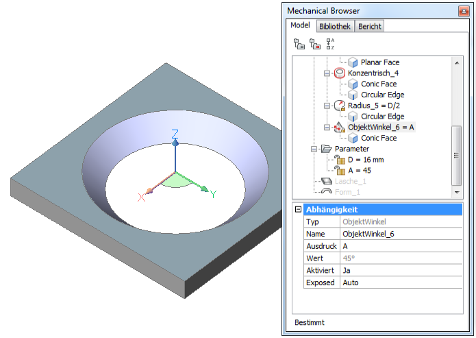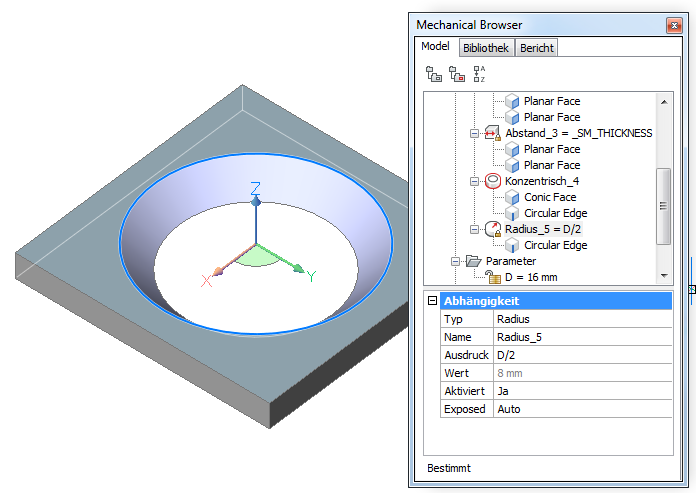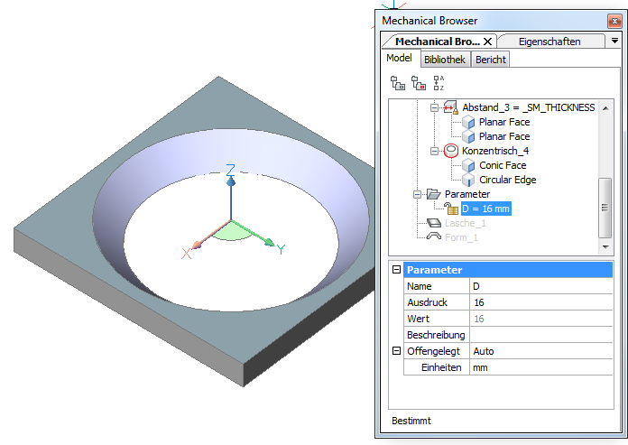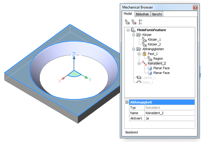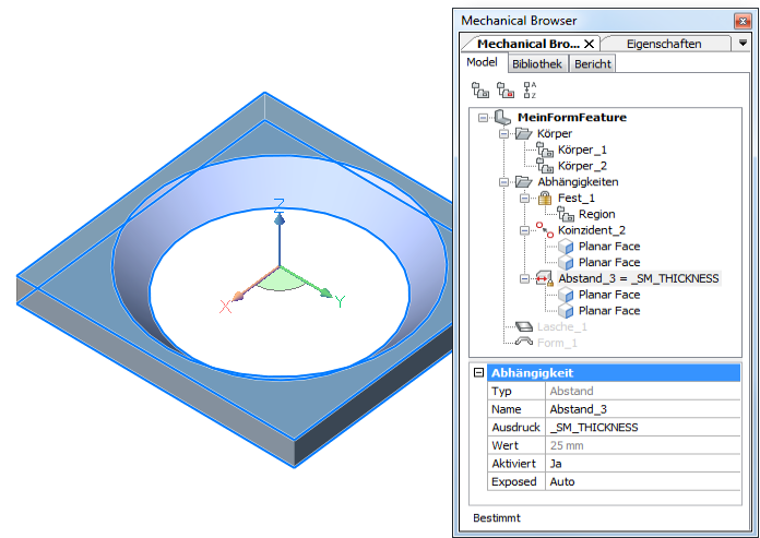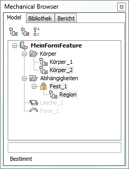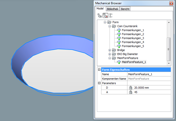Die Parameter eines einzelnen Form Features können entweder in der Eigenschaften Leiste oder im Mechanical Browser bearbeitet werden. Parameter von mehreren Form Features sind nur in der Eigenschaften Leiste editierbar.