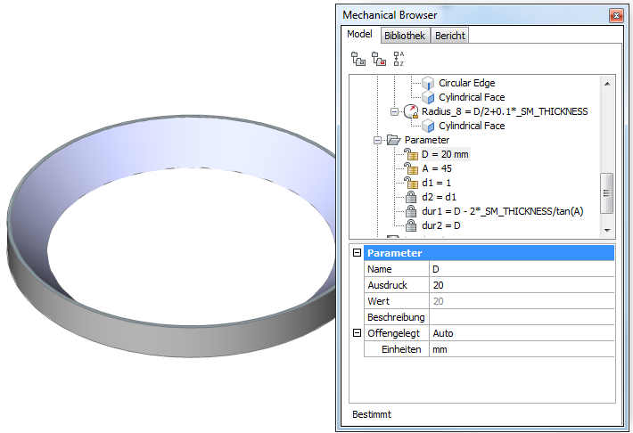 Wählen Sie einen Parameter im unteren Panel des Mechancial Browser und geben einen neuen Wert ein.