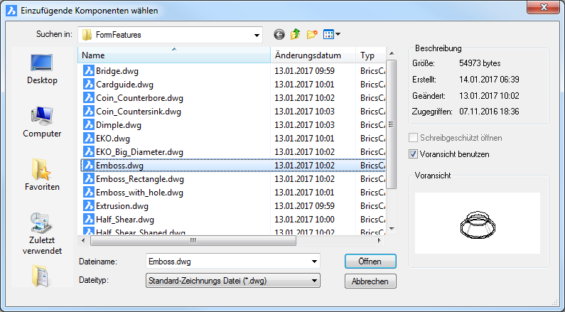 Wählen Sie das gewünschte Form Feature Element in der Datei-Liste aus, klicken Sie doppelt auf dieses oder drücken Sie die Schaltfläche Öffnen.