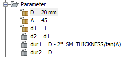 Hier sind zwei Parameter erforderlich: D für den Durchmesser des größeren Kreises des konischen Lochs und A für den Winkel der Fläche des konischen Lochs. In der Blechkonstruktion haben wir einen Parameter _SM_THICKNESS der gleich der Stärke des Blechbauteils ist.