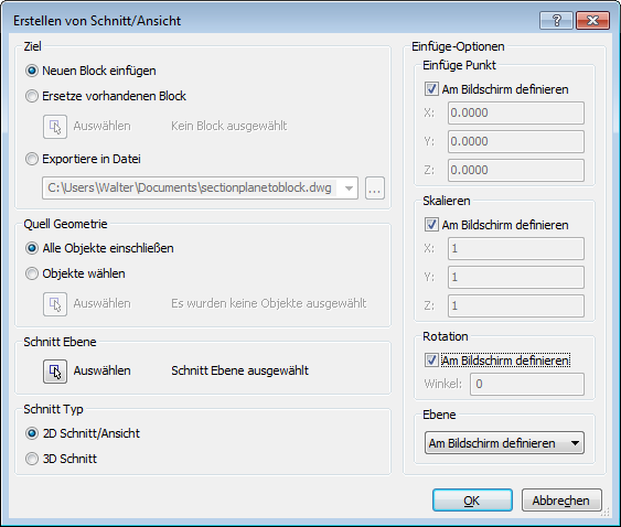 Der Dialog Erstellen von Schnitt/Ansicht wird geschlossen. Falls ein neuer Block erstellt wird, werden Sie aufgefordert, den Einfügepunkt, die Skalierung und die Drehung zu definieren. |