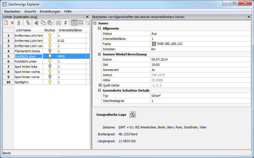 Menü: Werkzeuge | Zeichnungs Explorer | Lichter... oder Ansicht | Rendern | Lichter | Sonnen Eigenschaften...