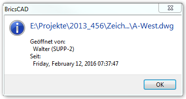 Die Informationen im Meldungsfeld wird in einer Temporärdatei DWL (Drawing Lock) gespeichert, die gelöscht wird, wenn die Zeichnung geschlossen wird.