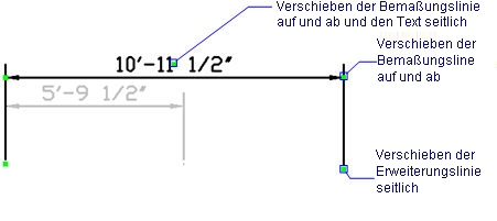 Ziehen Sie einen der beiden Griffe an der Bemaßungslinie, um die Bemaßungslinie zu verschieben; die Hilfslinien ändern ihre Länge.