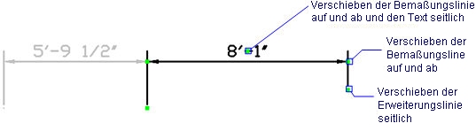 Ziehen Sie einen der beiden Griffe an der Bemaßungslinie, um die Bemaßungslinie zu verschieben; die Hilfslinien ändern ihre Länge.