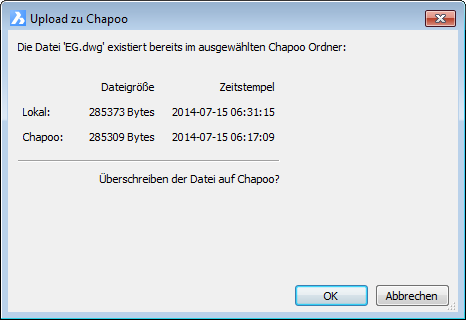 Lädt die Zeichnung in den ausgewählten Ordner hoch. Wenn die Zeichnung mit dem gleichen Namen bereits vorhanden ist, wird die Zeichnung als eine Revision der ursprünglichen Zeichnung hochgeladen. Ein Dialog wird angezeigt.
