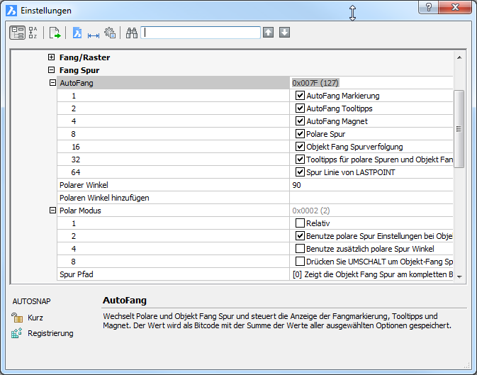 Tooltips für polare Spuren und Objekt Fang Spuren - schaltet die Anzeige der Tooltips; Voreinstellung = EIN.